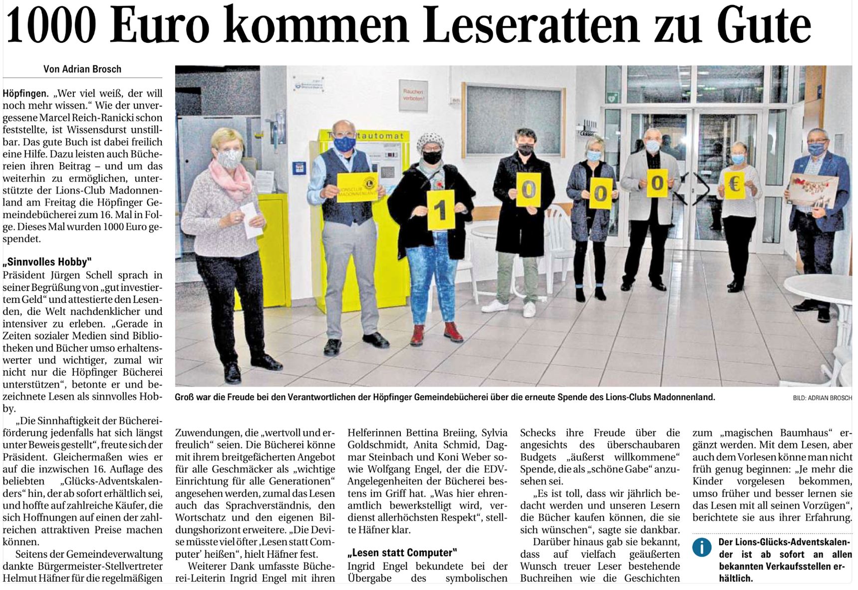 [02.11.20] Höpfingen (adb). Bereits zum 16. mal investiert der Lions Club Madonnenland einen Betrag von 1000,-€ in die Gemeindebücherei Höpfingen und dankt damit auch den ehrenamtlichen Helfern, die die Bücherei betreuen und sich auch einer guten Nachfrage erfreuen. Diejenigen die sich mit dem geschriebenen Wort auseinander setzen, sind auch in der Lage zu reflektieren. Die Sinnhaftigkeit der Büchereiförderung hat sich für den LC Madonnenland schon längst bewährt, da ein nachhaltiger Bildungsbeitrag geschaffen wird.